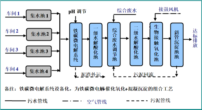 各類生產(chǎn)線的廢水進行單獨收集,之后統(tǒng)一送入初調(diào)節(jié)池中進行水質(zhì)的調(diào)節(jié),;預處理采用“鐵碳微電解+催化氧化+混凝沉淀”工藝,沉淀溢流到一級水解酸化池中,之后流入到綜合調(diào)節(jié)池中,與生活污水、清潔下水混合后,送入二級水解酸化池,水解后出水至生物接觸氧化池中進行好氧處理,處理后水進入沉淀池中,上清液排放。